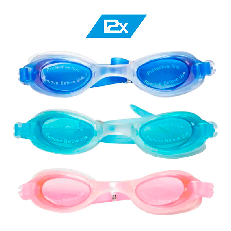 O Kit com 12 Óculos Infantil Promocionais possui alça com tira dupla no mesmo material. Lentes com alta resistência aos impactos, sistema anti-embaçante e garante total proteção contra raios UV. Ideal para natação diária. Possui tiras ajustáveis.